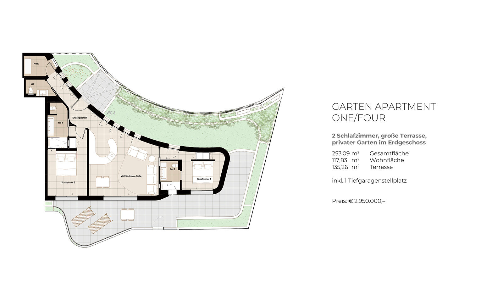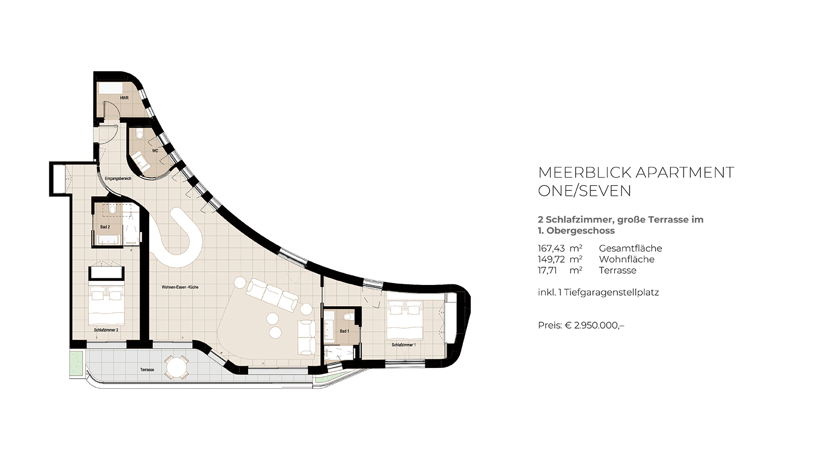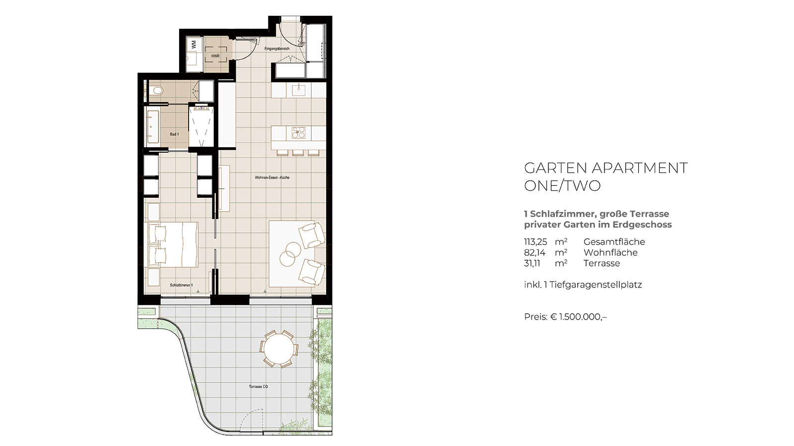 From ONE to TWELVE: Die Bandbreite der zwölf Apartments reicht von kompakten zwei Zimmern mit Pantry-Küche bis zum zweigeschossigen Penthouse mit separater Dachterrasse und eigenem Pool. Technik und Ausführung von THE ONE sind „Made in Germany“. Die Klimatisierung der Apartments und die Beheizung des Gemeinschaftspools erfolgt mit nachhaltiger und energiesparender Technologie. Die Tiefgarage hält neben den Abstellplätzen der Autos für jedes Apartment auch ein E-Bike bereit. Für das Penthouse sogar zwei.